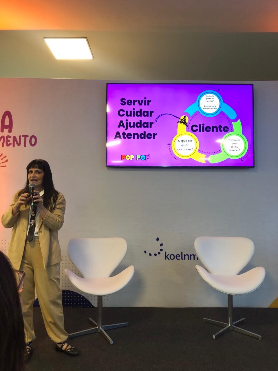Dentro da programação na Arena do Conhecimento, aconteceram diversas palestras sobre o segmento. Kátia Duarte do Blog Pop Pop abordou o tema: “Explore as tendências da moda infantil e torne-se um lojista de sucesso“, trazendo informações sobre as macrotendências que influenciam o mercado de moda, como alterações climáticas, puberdade precoce, moda circular, excesso de telas, entre outras.